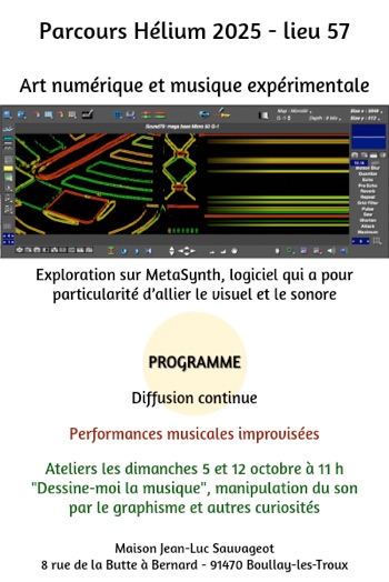 Les 4/5 et 11/12 octobre 2025 venez découvrir mon travail sur Boullay-les-Troux à la Maison Jean-Luc Sauvageot - 8 rue de la Butte à Bernard (lieu 57 sur la brochure et carte interactive)